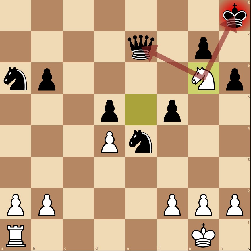 Example 1: In the position below, White has a strong knight on e5 which controls quite a few key squares such as f7 and g6. How can White continue?